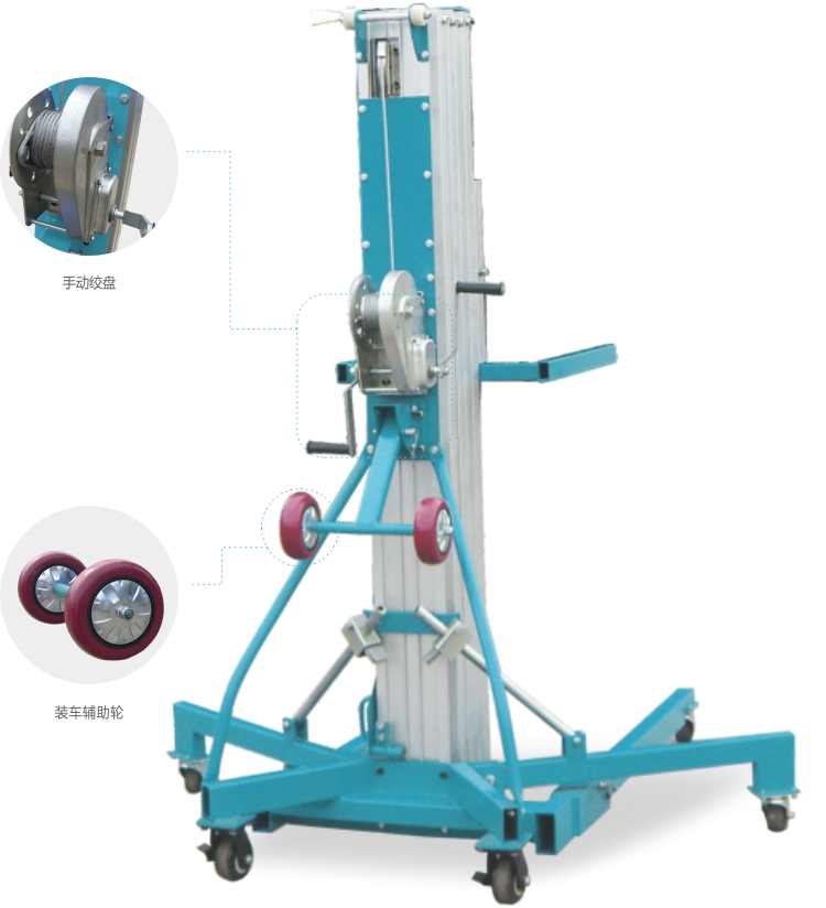 - 產品特點:備有雙速升降絞盤收藏時高度只有1.99m 非常精致輕巧,可進出一般通道,機背滑輪藏于機身背部有助于搬運上下貨車,方便運輸